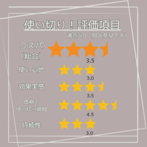 1日2回以上は歯磨きをしているので持続性という部分では評価が難しいため真ん中評価にしています。口臭や虫歯予防に関してはそもそも効果実感のところで改善が無いのでもちろん持続力に関しても普通の印象です。