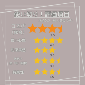 低価格アイテムなので使い切り期間も短いですが、コスパとしては真ん中より少し上の評価です。
