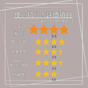 すぐに乾燥が気になるわけではないですが、さらさら肌が持続されている実感も圧倒的にはないので真ん中評価にしました。