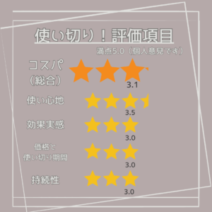 この商品の使用前にクレンジング・洗顔料の必要があるのでスペシャルケアアイテムとしては使い切りあたりのコスパは真ん中評価です。