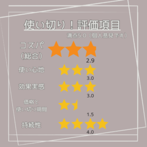 保湿の実感以外は見た目の効果実感ができなかったため真ん中の可もなく不可もなくの評価です。