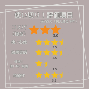 化粧水や美容液と比較するとフェイスマスクは使い切りあたりのコスパ評価がどうしても低くなってしまします。フェイスマスクとしては真ん中くらいのコスパ評価です。