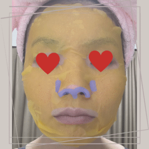美容液がたっぷりなのに付けにくさは少なかったです。ただマスクがしっかりしているので破りにくかったり伸びにくかったりして気になるところを全てきっちり覆うことができませんでした。(青印のところが覆えなかった箇所)敏感肌でも染みることはありませんでしたが、乾燥しまっくてたり肌荒れがひどすぎたら少しピリつくかも
