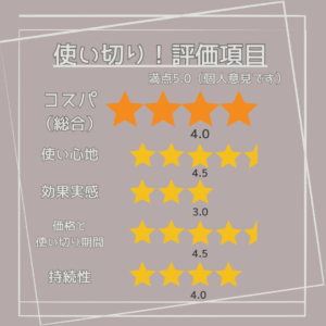 - 使い切り期間:97日(1日2回 朝晩スキンケア時 1回100円玉大になる量使用)