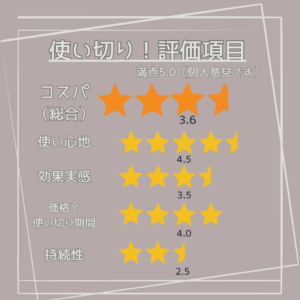 使い切りあたりのコスパは高評価ですが、ハンドクリーム自体の使い切りあたりのコスパが良い物が多いので平均的な評価だと思います。