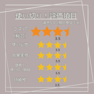 スキンパックの中では少し安めの価格ですが、使い切りあたりのコスパとしてはだいたいの商品と大差ないため真ん中少し上の評価です。