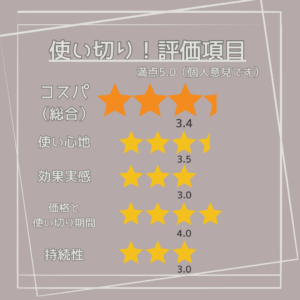 低価格でさらに使い切りも1ヶ月ちょいだったので使い切りあたりのコスパもそこそこ良かったです。