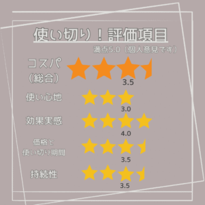 美容液としては真ん中くらいの使い切りあたりのコスパ評価です。フェイスパックよりもやはり安く毛穴ケアできるかと思います。