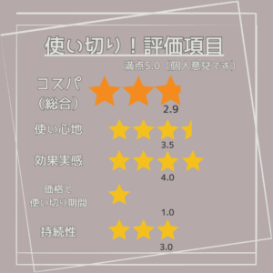 - 使い切りあたりのコスパはイマイチ