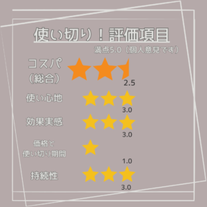 - 1回あたりの価格が市販アイテムとしては高いものの、その分の効果実感がなかった