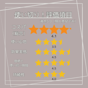 使い切りにも時間がかかったので使い切りあたりのコスパを考えると高評価です。W洗顔不要の1アイテムよりもクレンジングと洗顔の2アイテム足した1日あたりの価格の方が安い場合もあるのでアイテムの選び方だと思います。