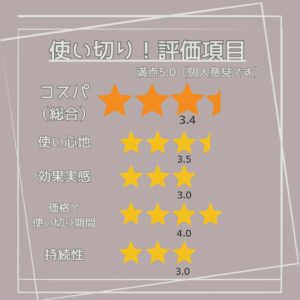 毎日使用するものなので、ニキビ予防の持続力の有り無しが判断しにくく真ん中評価にしています。